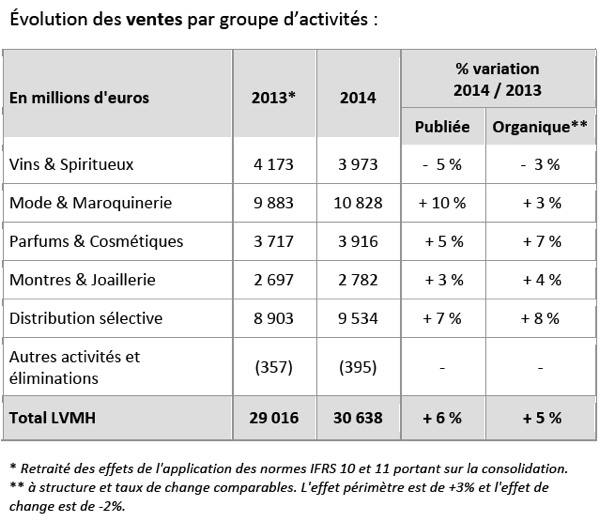Le leader mondial des produits de luxe, LVMH Moët Hennessy Louis Vuitton, a réalisé en 2014 un chiffre d’affaires de 30,6 milliards d’euros, en progression de 6 %. Toutefois, le résultat opérationnel du groupe a reculé de 5%.