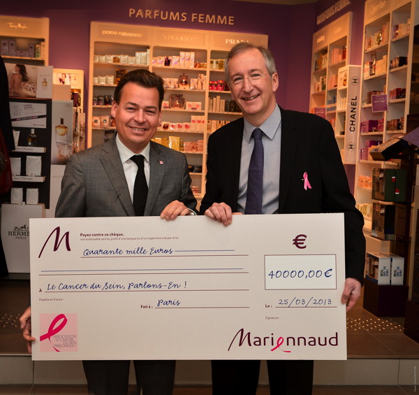 Marionnaud a remis hier un chèque de 40 000 euros à l’Association « Cancer du sein, Parlons-en ! » pour soutenir la campagne de dépistage précoce du cancer du sein.