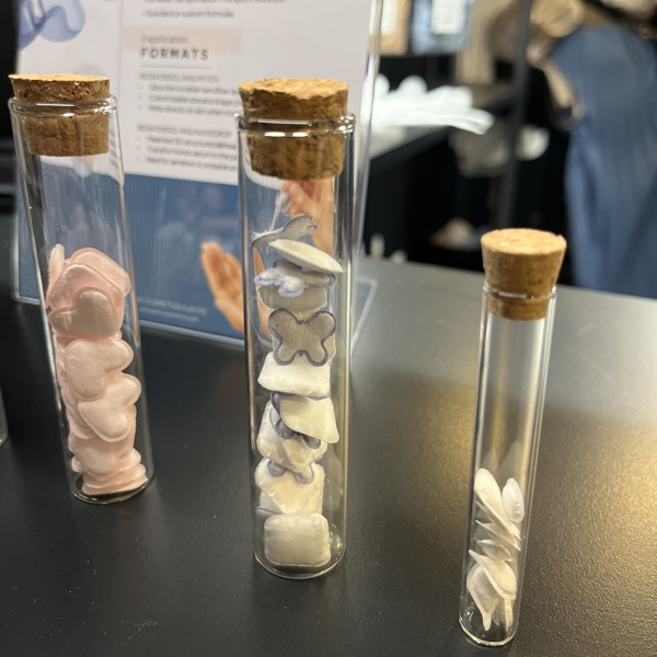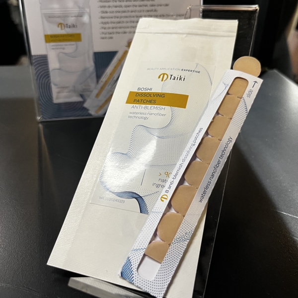 Taiki a présenté différents exemples d’application – en format patchs prédécoupés ou doses 3D – qui utilisent cette technologie pour délivrer des actifs de soin de la peau pré-dosés :