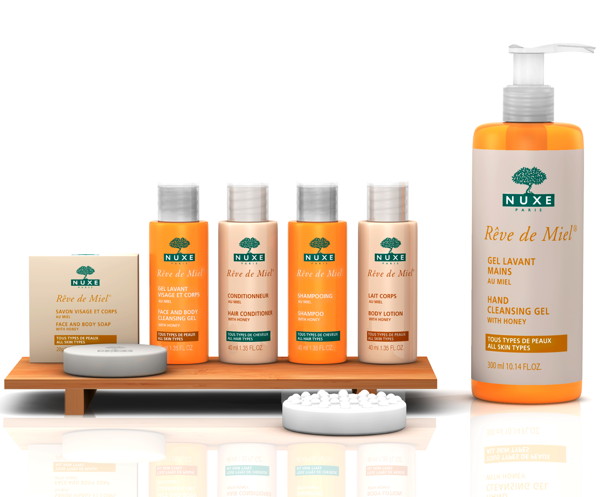 Parfumée et enrichie au miel, la ligne de produits d’accueil Rêve de Miel® se compose de produits pour le bain ou la douche en flacons 40 ml, gel douche, shampooing, après-shampoing, gel corps et cheveux, d’un lait pour le corps, de deux savons doux, de flacons distributeurs grand volume Ecopump 300ml et d’un flacon miniature 10 ml d’Huile Prodigieuse, best-seller de la marque Nuxe. Pour compléter l’offre cosmétique, le Groupe GM propose également une ligne d’accessoires assortie aux cosmétiques.