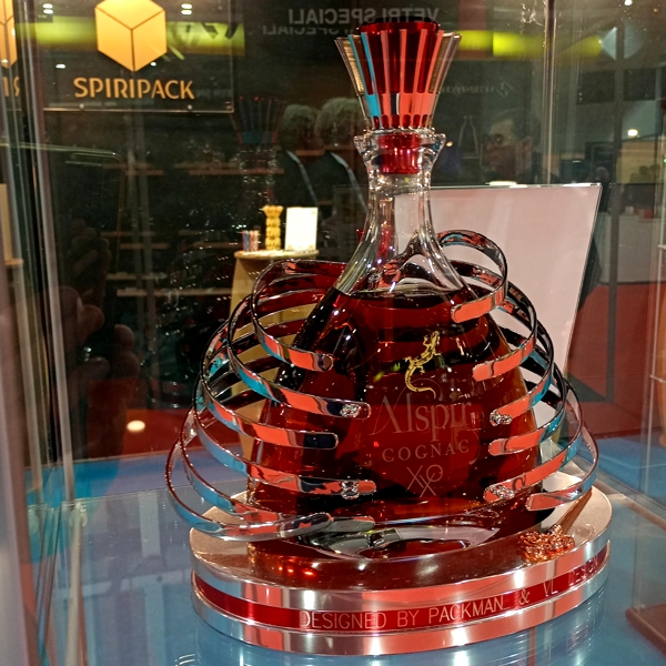 Baptisée Alspir, la carafe réalisée en collaboration avec VL Design est dotée d’une enveloppe en métal développée par PackMan. Pensée comme une pièce de joaillerie ou de cosmétique de luxe, fruit de deux années de développement, le luxueux écrin a capté l’attention des visiteurs du salon du VS Pack, avec sa forme proche d’une cage thoracique qui enveloppe le corps (la bouteille) et de la clé qui maintient le tout.