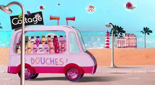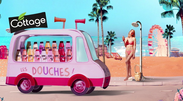 Pour exprimer pleinement son territoire de marque original et décalé, la marque a choisi d’utiliser la technique du stop motion pour recréer un véritable univers visuel, très vite identifiable. Balnéaire, ensoleillé, fun, coloré, enthousiaste, pétillant… le monde Cottage est gourmand avant tout. La marque a choisi de mettre en avant le « Cottage Truck », véritable clin d’oeil au marchand de glace de notre enfance, et surfant au passage sur la mode des food truck. Réglisse, caramel, vanille / fraise… la voix-off énonce des parfums tous plus gourmands les uns que les autres et qui sont en fait des références de Douche Lait, la gamme principale de Cottage.