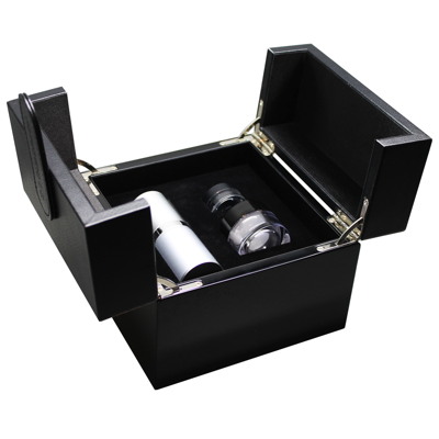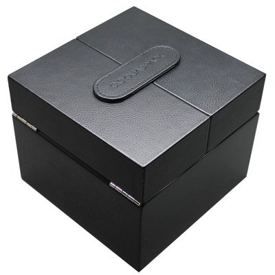 Le coffret en bois est composé d’une base et d’un couvercle en deux parties. La base est recouverte d’une laque brillante, et le couvercle est revêtu de similicuir en polyuréthane. Ses deux parties se rabattent vers l’extérieur à l’aide de quatre charnières en métal argenté. Le tout est maintenu par une lanière en similicuir dotée d’un fermoir magnétique décoré d’un logo gravé. L’intérieur du coffret est doublé de satin noir, avec un insert floqué où vient se loger le produit.
