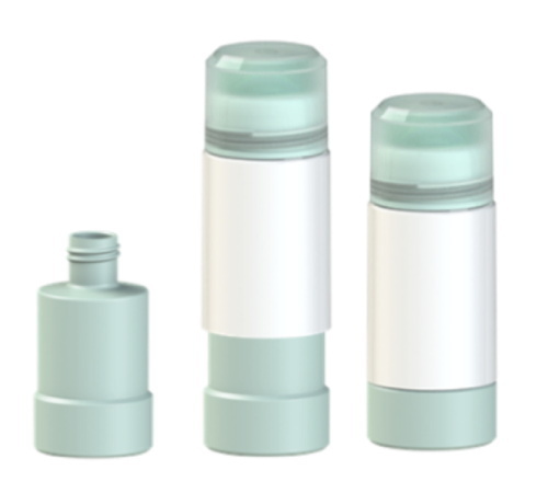 La paroi épaisse du pot extérieur peut être en PET-G, avec la possibilité d’intégrer du Tenite®, une matière cellulosique développée par Eastman. Toutes les gammes sont personnalisables, et le client peut décorer le pot aussi bien que les recharges.