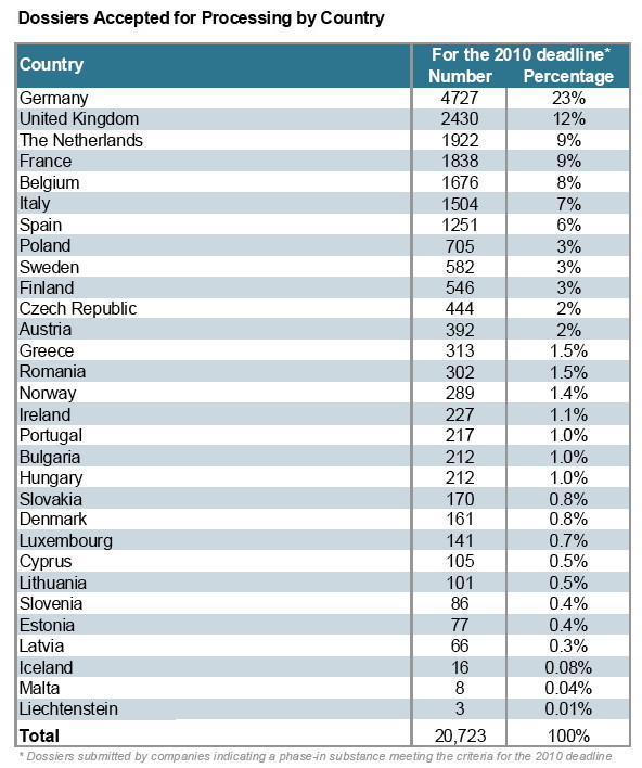 Environ 86 pour cent des enregistrements ont été effectués par les grandes entreprises et 14 pour cent par de petites ou moyennes entreprises. Les Représentants Exclusifs (sociétés représentant des fabricants basés en dehors de l’UE) ont réalisé 19 pour cent des inscriptions. À l’image du marché européen des produits chimiques, la plupart des enregistrements proviennent de sociétés basées en Allemagne, au Royaume-Uni, aux Pays-Bas, en France et en Belgique. [2]