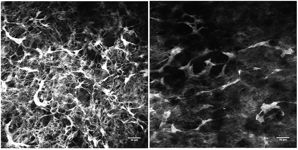 Au cours de la phase initiale d’essais en laboratoire, l’équipe de chercheurs a eu recours à l’impression 3D pour créer des modèles de peau et étudier l’efficacité de ce complexe. Cette méthodologie innovante, la bio-impression assistée par laser, consiste à générer un modèle de peau humaine à partir de cellules cutanées. Elle permet de réaliser des essais rapides et réalistes avant de passer à la phase in vivo. À ce stade, le nouveau complexe a permis de générer un réseau de collagène bien plus dense que le mélange contrôle, une association de peptides standard disponible sur le marché. La visualisation par génération de seconde harmonique (SHG), un processus optique de haute précision doté de la technologie laser, a démontré l’amélioration de la densité. En un mot, les photons émis par les rayons laser se comportent différemment selon les matériaux avec lesquels ils interagissent. Ces différences sont visualisées sous forme d’image : dans ce cas précis, celle des fibres de collagène dans les échantillons de peau imprimée en 3D (cf. Figure 1).