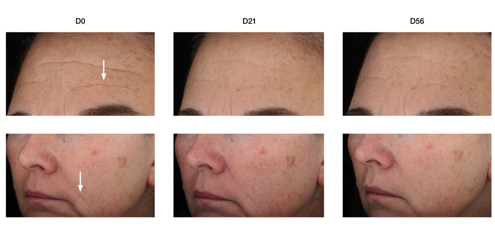 Enfin, les études in vivo réalisées chez des femmes volontaires âgées de 45 à 65 ans ont confirmé l’efficacité de ce complexe synergique doté d’une bonne biodisponibilité cutanée. L’apparence des rides et ridules a été réduite de 11 % après trois semaines, et jusqu’à 23 % après huit semaines. Ainsi, trois types de rides ont été visiblement et considérablement réduites : pattes d’oie, rides du front et « rides du sourire », ou sillons naso-géniens (cf. Figure 2). En outre, on a observé une amélioration de la densité dermique de 21 % en trois semaines. Cette augmentation de la fermeté de la peau, mesurée par ultra-sons, révèle un effet anti-âge comparable à un rajeunissement de l’apparence de sept ans.