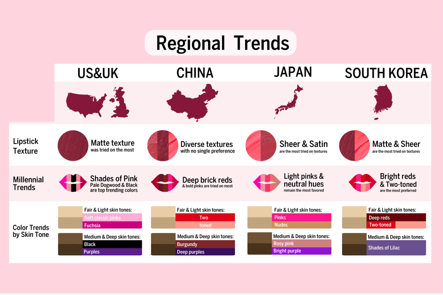 – Le fini est important et le mat est en tête à l’Ouest tandis que l’Asie reste plus classique. « Le mat est un fait » aux US et au Royaume Uni avec plus de 40% d’essais mensuels. Les utilisateurs en Asie de l’Est préfèrent les textures plus simples de manière générale. Les utilisateurs au Japon préfèrent clairement les rendus brillants, en tête avec plus de 50% des essais mensuels. Les fans de K-Beauty en Corée préfèrent le mat à 35% et le brillant à 33%.