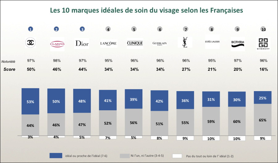 Trois marques, Chanel (50%), Clarins (46%) et Dior (44%) composent le trio de tête de ce classement.