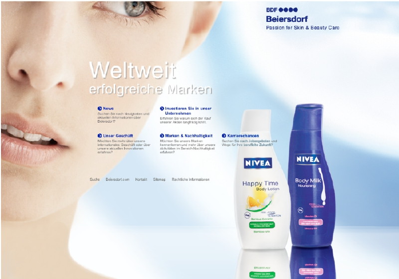 L’accent a surtout été mis sur les marques mondiales de la société : Nivea, Eucerin, et La Prairie. Les utilisateurs disposant toujours de liens pour obtenir plus d’information sur la marque. De plus, un menu latéral permanent permet d’accéder à tout moment à la section Brand and Innovation.