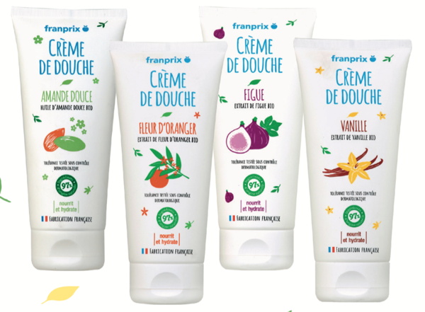 Pour le corps, Franprix propose le Lait nourrissant corps au beurre de karité, trois savons solides déclinés en versions hydratante au lait d’ânesse, purifiante à l’argile verte, ou non parfumée, ou encore des crèmes de douche aux parfums divers et variés (figue, amande douce, fleur d’oranger, vanille) dans différents formats.
