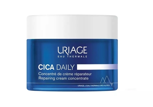 Le soin Cica Daily Concentré de Crème Réparateur 50 ml est conditionné dans un pot rechargeable de 50 ml en PET intégrant 30 % de matière recyclée PCR, teinté bleu dans la masse et sérigraphié blanc. Le dispositif associe une cuvette recharge en PP blanc avec opercule et une capsule en PP blanc. La cuvette en PP et son opercule sont recyclés, tandis que le pot et la capsule sont conservés durablement.